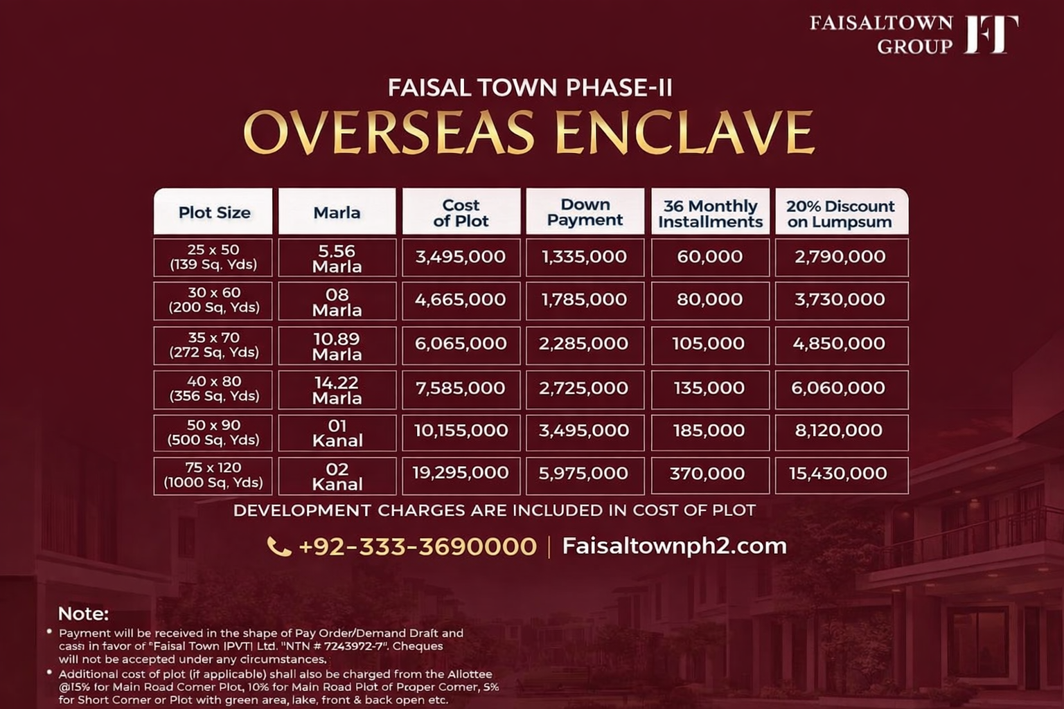 The Overseas Enclave Faisal Town Phase 2 Islamabad is one of the best real estate investment opportunities in Pakistan in 2026. With a prime location, modern infrastructure, flexible payment plans, and high future value, it is ideal for overseas Pakistanis, investors, and end users.